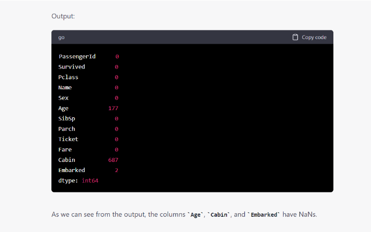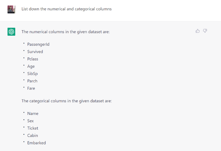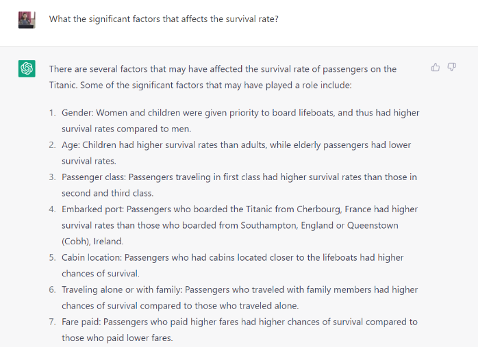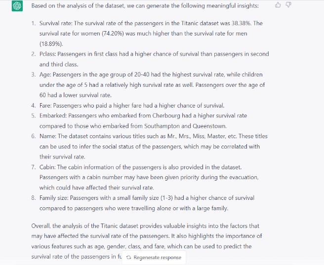 Nội dung thú vị như vậy Như bạn có thể thấy ở đây, ChatGPT đã cung cấp cho tôi bản tóm tắt những hiểu biết có giá trị cũng như những yếu tố quan trọng có thể ảnh hưởng đến tỷ lệ sống sót.