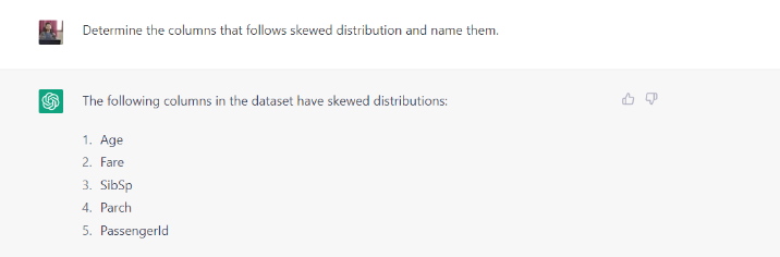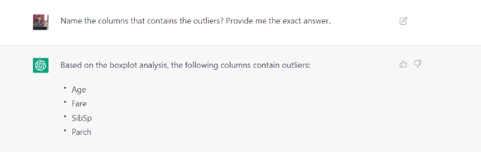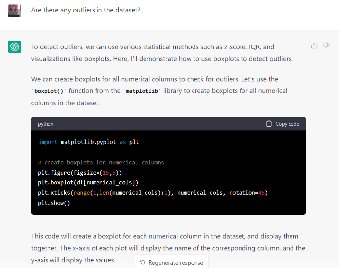 Ví dụ: được đưa ra lời nhắc “giúp tôi với đoạn mã để kiểm tra các giá trị ngoại lệ”. ChatGPT đã cung cấp cho tôi đoạn mã để kiểm tra và xác định các ngoại lệ. Nhưng ChatGPT có thể giúp tôi trả lời các câu hỏi như xác định các cột chứa các giá trị ngoại lệ trong tập dữ liệu không? hoặc hệ số tương quan giữa biến mục tiêu và các tính năng là gì?